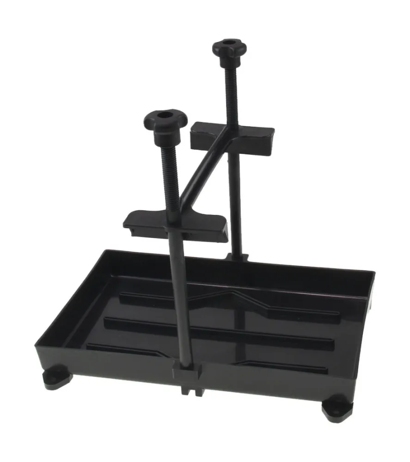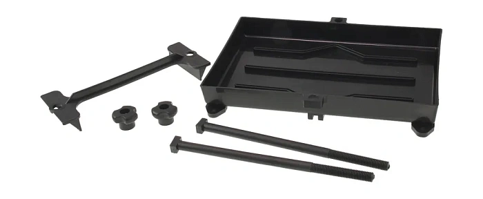 Лоток-крепление для аккумуляторной батареи изготовлен из химически стойкой пластмассы. Конструкцией лотка предусмотрено крепление АКБ 275х175 мм при помощи шпилек и поперечной прижимной планки.
