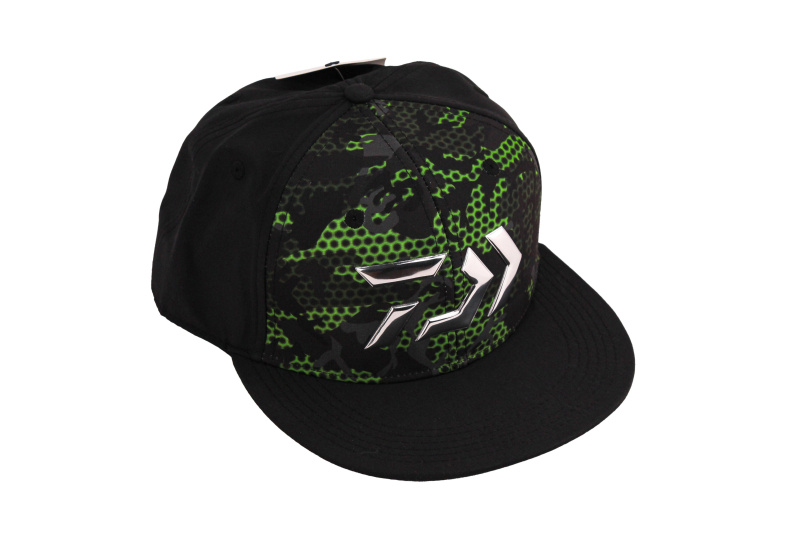 Кепка с плоским козырьком, украшенна новым рисунком Daiwa и большим тисненым хромированным логотипом D-Vec спереди.