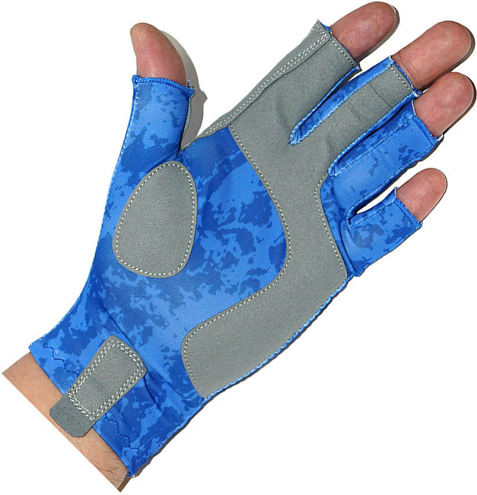Они довольно тонкие и удобно сидят на руке, защищая тыльную сторону ладони, пальцы и запястье от палящего или яркого солнца. На внутренней стороне (со стороны ладони) на перчатках Kosadaka Sun Gloves пришиты усиления в местах соприкосновения руки с удилищем. Перчатки без пальцев, а значит смена приманки, разматывание лески и прочие манипуляции  можно осуществлять не снимая перчаток.